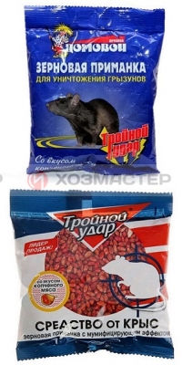 Средство от крыс и мышей Тройной удар по форме схоже с едой большинства грызунов и напоминает семечки. Приманка в таком исполнении наилучшим образом притягивает всех находящихся вблизи грызунов и воздействует прямо на их печень. Средство обладает мумифицирующим эффектом, а это значит, что при гибели грызуна в закрытом помещении вы не почувствуете его запах. Одного пакета приманки хватает на 2-3 раза. Если вы заметили, что грызунов в вашем доме стало меньше, значит выбранное для приманки место отлично подходит для избавления от вредителей, но останавливаться на достигнутом не стоит - останавливать процесс стоит останавливать только после полного истребления вредителей с территории жилища.