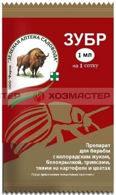 Жидкий инсектицид в ампуле "Зубр" предназначен для уничтожения листогрызущих и сосущих насекомых-вредителей на растениях. Очень эффективен против колорадского жука на картофеле, тли, трипсов и белокрылки на цветочных растениях.