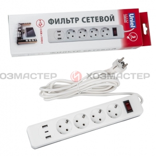 СЕТЕВОЙ ФИЛЬТР 4-гнезд 3.0М с З/К ВЫКЛ 2USB+1TYPE-C "UNIEL" UL-00012108